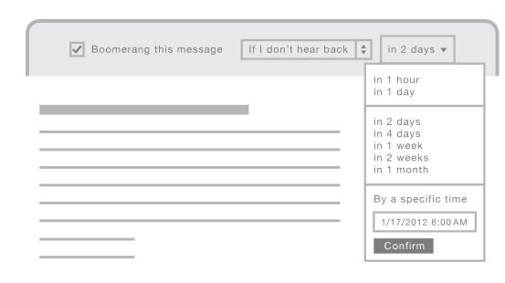 در این صورت اگر شخص دریافت کننده ایمیل در طی دو روز به آن پاسخ ندهد، بومرنگ ایمیل را به من ارسال میکند. به این ترتیب میتوانم فورا پیگیری آن را شروع کنم و ویژگی خوبش این است که مطمئنم با فردی که به ایمیل من پاسخ داده اشتباها تماس نمیگیرم.
