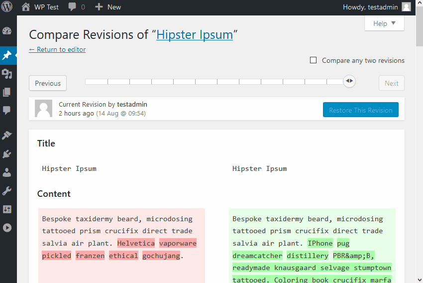 شما میتوانید به صورت پیشفرض دو بازبینی هم جوار را مقایسه کنید. با این حال، اگر گزینه “Compare any two revisions” را علامت بزنید میتوانید تفاوت بین بازبینی پستهایی که پشت سر هم نیستند را هم مشاهده کنید.