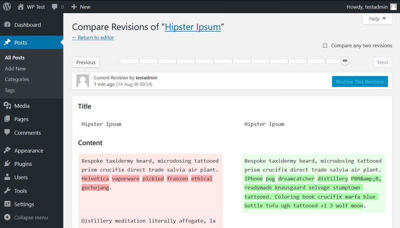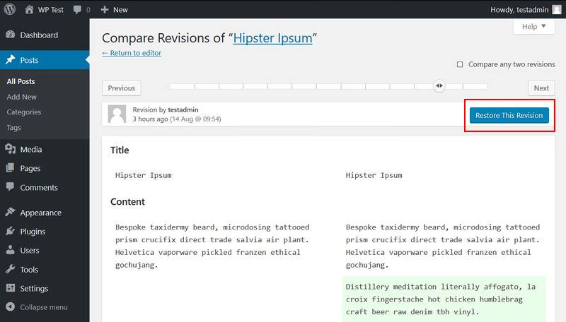 صفحه مدیریت رونوشتها به شما اجازه میدهد تا تفاوتهای بین ورژنهای مختلف پست خود را بررسی کنید. بخش اصلی صفحه، دارای ابزار مقایسه تفاوتها است.
