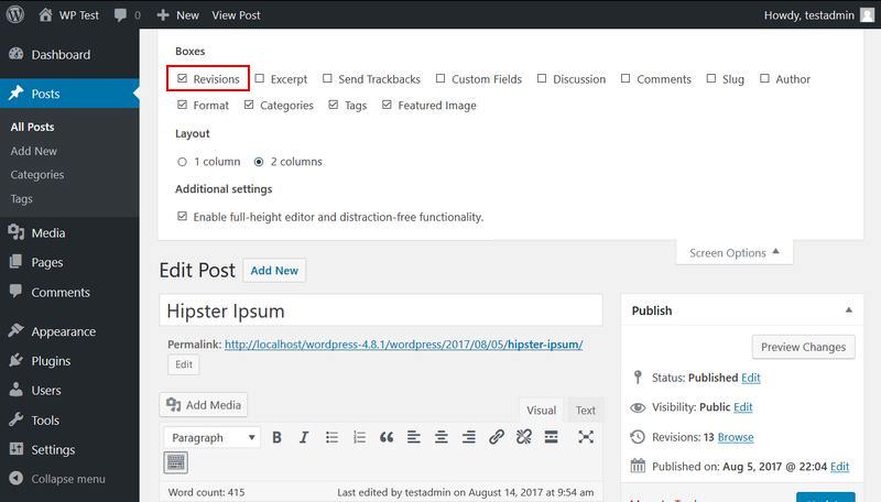 یک راه دیگر هم برای دسترسی به بازبینی از طریق صفحه “Edit Post” یا “Edit Page” وجود دارد. منوی “Screen Options” (تنظیمات صفحه) در بالای صفحه را باز کنید، و گزینه “Revisions” را علامت بزنید. به این ترتیب یک باکس اضافی در زیر ویرایشگر وردپرس اضافه میشود و از آن میتوانید به بازبینیها دسترسی پیدا کنید.