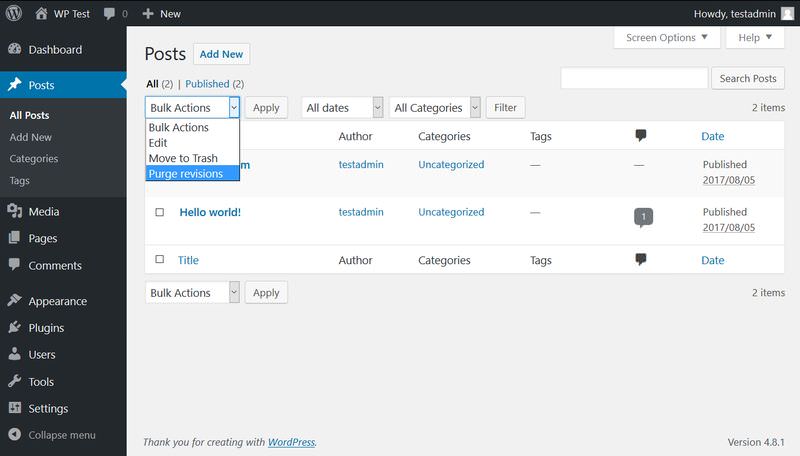 پلاگین Simple Revision Delete همچنین یک آپشن “Purge revision” به صفحات “All Posts” و “All Pages” اضافه میکند. شما با استفاده از این مشخصه میتوانید از شر بازبینیهای ناخواسته پست به صورت گروهی رهایی پیدا کنید.