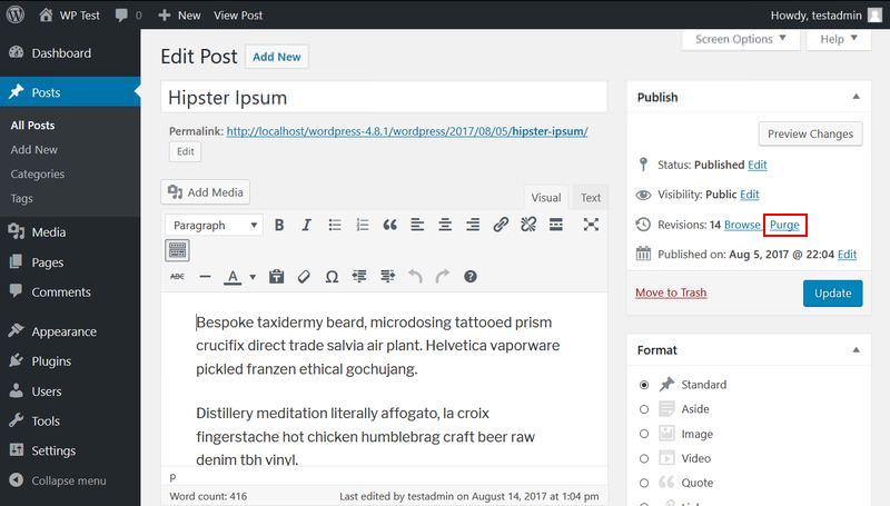 Simple Revision Delete یک پلاگین ساده اما مفید است. این پلاگین یک صفحه پلاگین به ادمین وردپرس اضافه نمیکند، فقط یک دکمه زیبا با عنوان “Purge” به صفحه “Edit Post” اضافه میکند. این دکمه تمام بازبینیهای متعلق به یک پست را حذف میکند. راه بسیار خوبی برای کاهش سریع اندازه دیتابیس شما است.