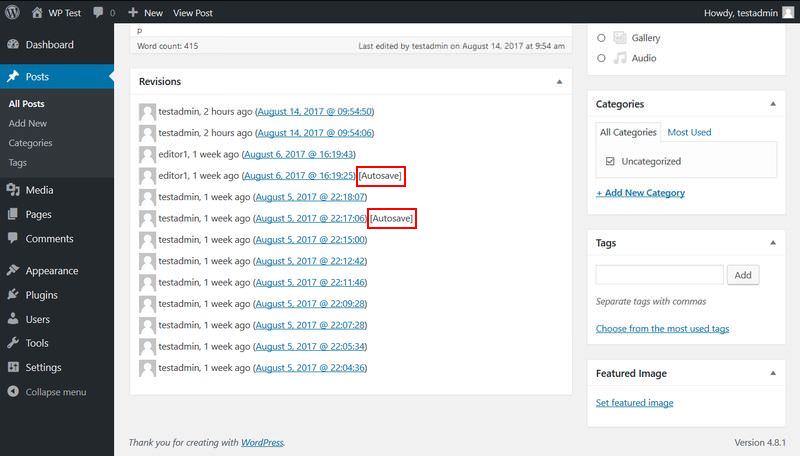 وردپرس همچنین با مشخصه ذخیره اتوماتیک خود رونوشت هایی ایجاد میکند. Autosave برای همه پستها و صفحات به صورت پیشفرض فعال است و شما نمیتوانید آن را خاموش کنید، با این حال این امکان وجود دارد که بتوانید فواصل ذخیره اتوماتیک را تغییر دهید (در پایین ببینید). مقدار پیشفرض ذخیره اتوماتیک هر 60 ثانیه است.